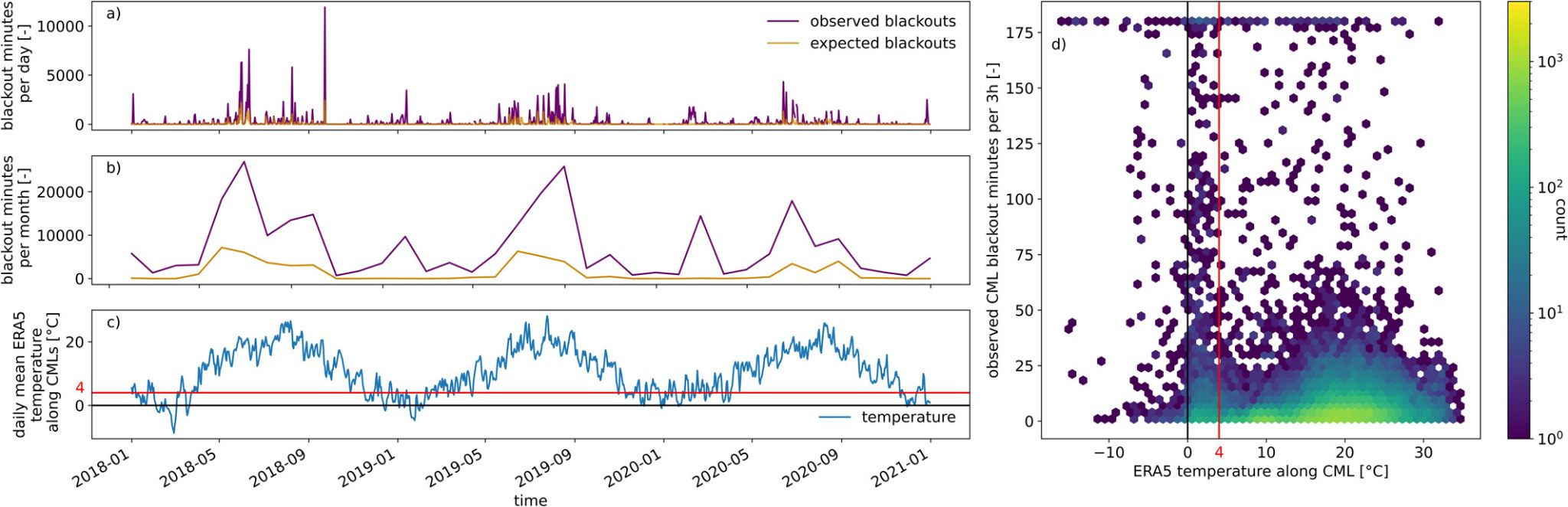 Figure P1-9 (from Polz et al. 2023): (a and b) show the observed and expected number of blackouts per day and month between 2018 and 2020. ( c ) shows the mean 2 m temperature along all commercial microwave links (CMLs) derived from ERA-5-land. (d) shows the observed number of blackout minutes per CML per 3 hr compared to the average ERA5-land 2 m temperature along the link path during the same period. The red line in (c and d) indicates the 4°C threshold below which mixed type precipitation is more likely. 17.7% of all observed blackouts occurred below this threshold.