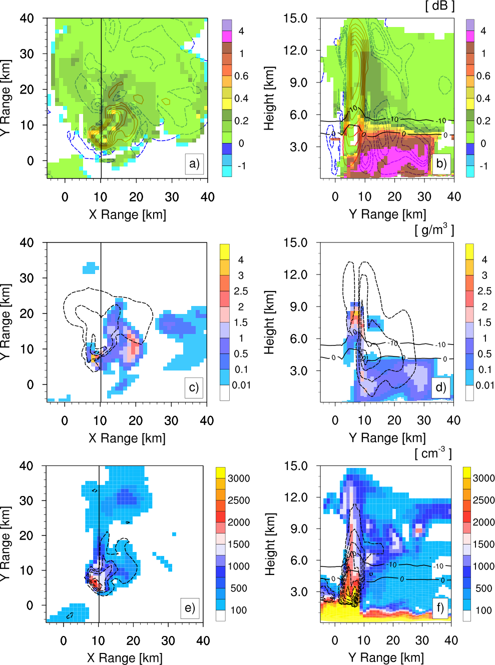 Figure 1: Plan view (left column) and vertical cross section (right column) of a polarimetric variable, hydrometeors, and aerosols. The plan views are shown at 6 km height, and all cross sections along the solid line indicated in the plan view. The 0o and 10 o C isotherms are also shown in all cross sections. (a, b) Synthetic differential reflectivity ZDR (color fill) is shown together with updrafts (solid/dashed red lines) and downdrafts (solid/dashed blue lines). The vertical wind speed contours are shown at the following intervals (-7.0, -5.0, -3.0, -1.0, 5.0, 10.0, 15.0, 20.0, 25.0, 30.0, 35.0, 40.0) in meters per second. (c, d) Rain and hail mixing ratios and (e, f) aerosol and cloud number concentrations are shown in filled and solid line contours, , respectively. The cloud number concentration is contoured at an interval of 500 cm-3, with a minimum of 100 cm-3. The chemical transport model consists of 12 modes of aerosols, namely nucleation and accumulation mode for pure and mixed aerosol particles (sulfate, ammonium, nitrate, organic compounds, water, and soot), small, medium, and large particles for dust and sea salt, soot particles, and coarse particles (not used for the nucleation parameterization). Here, the aerosol concentration is shown for the pure and mixed nucleation and accumulation model aerosols only.