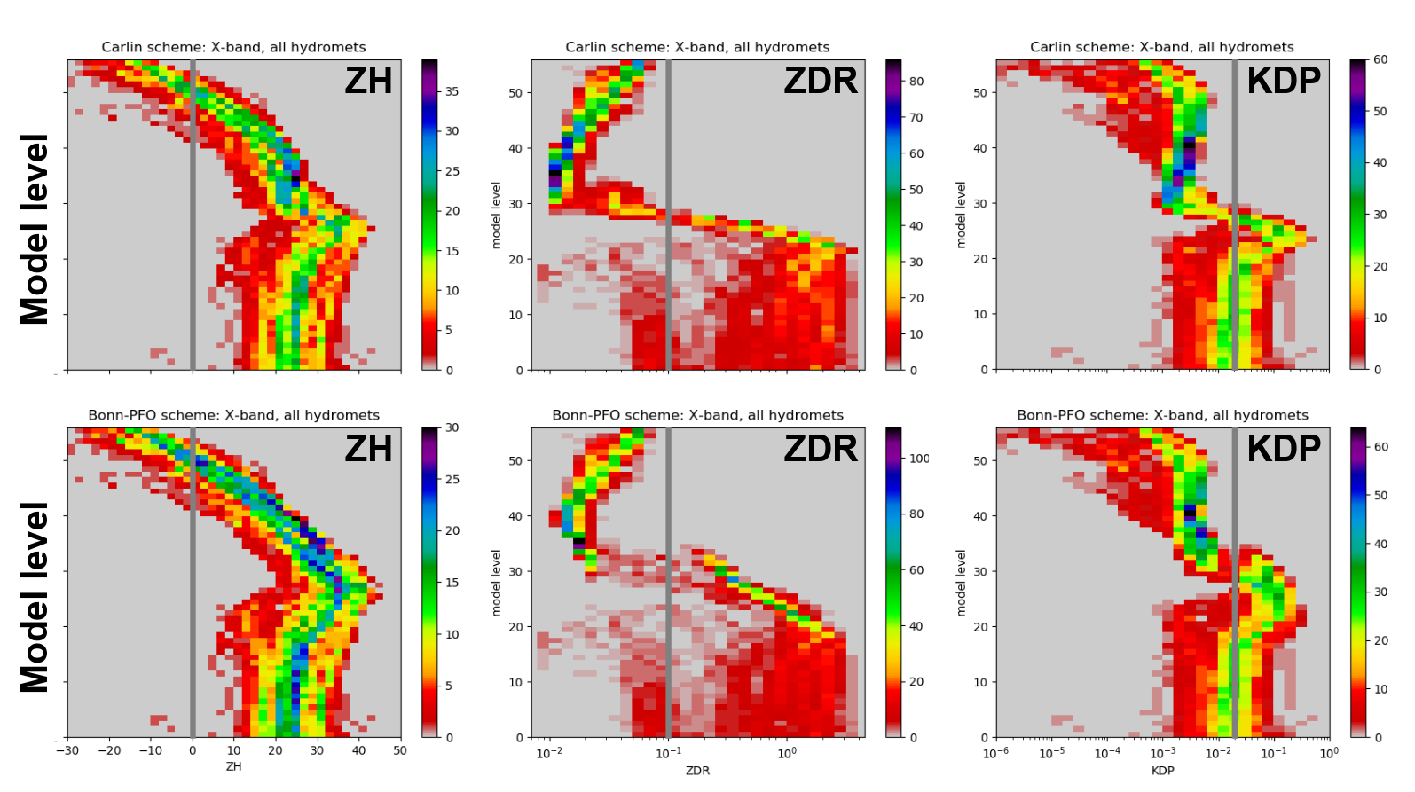 Figure 3: Histograms of simulated observable polarimetric radar parameters as function of height (model level) for two different melting parametrizations. Left: reflectivity in horizontal polarization ZH, middle: differential reflectivity ZDR, right: specific differential phase KDP. Bottom: Original BPFO scheme with many hardcoded parameters, latent heat flux induced, below-0C melting and dynamic estimate of the maximum temperature Tmax, where ice still exists. Top: BPFO with now user-contollable melting scheme parameters, set to Carlin-FO like values (no below-0C melting, fixed but hydrometeor type dependent Tmax). Grey lines indicate rough estimates of measurement uncertainty.