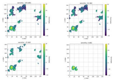 Figure. 4: CR-SIM tests: 2. Comparisons of radar reflectivity with different sensitivity assumptions for shallow cumulus case of LASSO experiment.