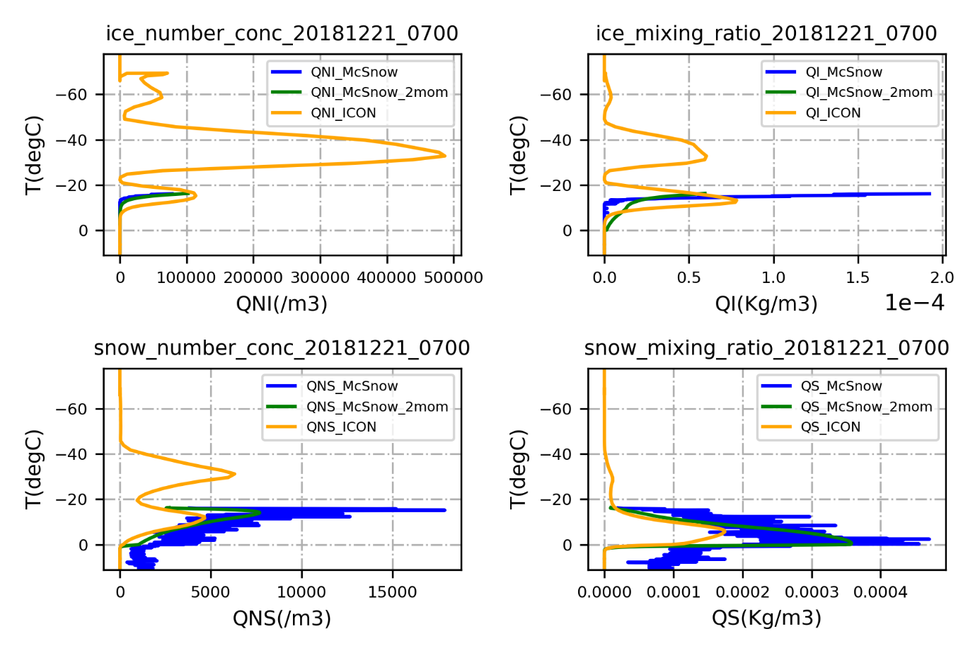 Our objective of realistic snow shape simulation using the McSnow and snow particle model combination includes real test cases from the winter TRIPEX Campaign (2018-19) over Julich. We selected some of the campaign days where there were snowfall events. Radar reflectivity images from the campaign observations help us look into the cloud patterns, and we choose cloud cases that are stratiform in nature to avoid heterogeneity. As input to the McSnow model, that particular cloud event's thermodynamic profile (pressure, temperature, height, and specific humidity) must be provided. We use thermodynamic profiles from ICON simulations (data storage at the University of Cologne). There is a challenge when we provide ICON simulated profiles to the McSnow. ICON is a 3D model that uses a 2-mom microphysics scheme, while McSnow is a 1D Lagrangian model. Therefore, it is essential to check whether the ice and snow profiles simulated in McSnow are comparable to those of ICON ice and snow profiles. A deeper understanding was needed to choose the TRIPEX campaign dates or events for the McSnow simulation. During the one-week visit to DWD Offenbach, I discussed the methodologies and steps appropriate for ICON and McSnow comparisons with Dr. Christoph Siewert (DWD) and Dr. Axel Seifert (DWD). Also, I simulated McSnow ice and snow profiles to check which dates of the TRIPEX campaign are unsuitable for MCSnow simulations and which are appropriate. For example, figure 1 below shows ice number concentration (QNI), ice mixing ratio (QI), snow number concentration (QNS), and snow mixing ratio (QS) simulated from the McSnow Lagrangian model (blue line) for the date 21st December’2018 and time 07 am and the ICON simulated profiles (Orange line). Besides that, McSnow also includes a two-moment scheme (same as ICON) for the simulation of ice and snow profiles. Therefore, we have also analyzed the two-moment simulation from McSnow (Green line). Figure 1 shows relevant matches between ICON and MCSnow ice and snow profiles. Therefore, we choose this real case from the TRIPEX campaign. The initial conditions used for the McSnow simulation are written on the upper left of Figure 1.