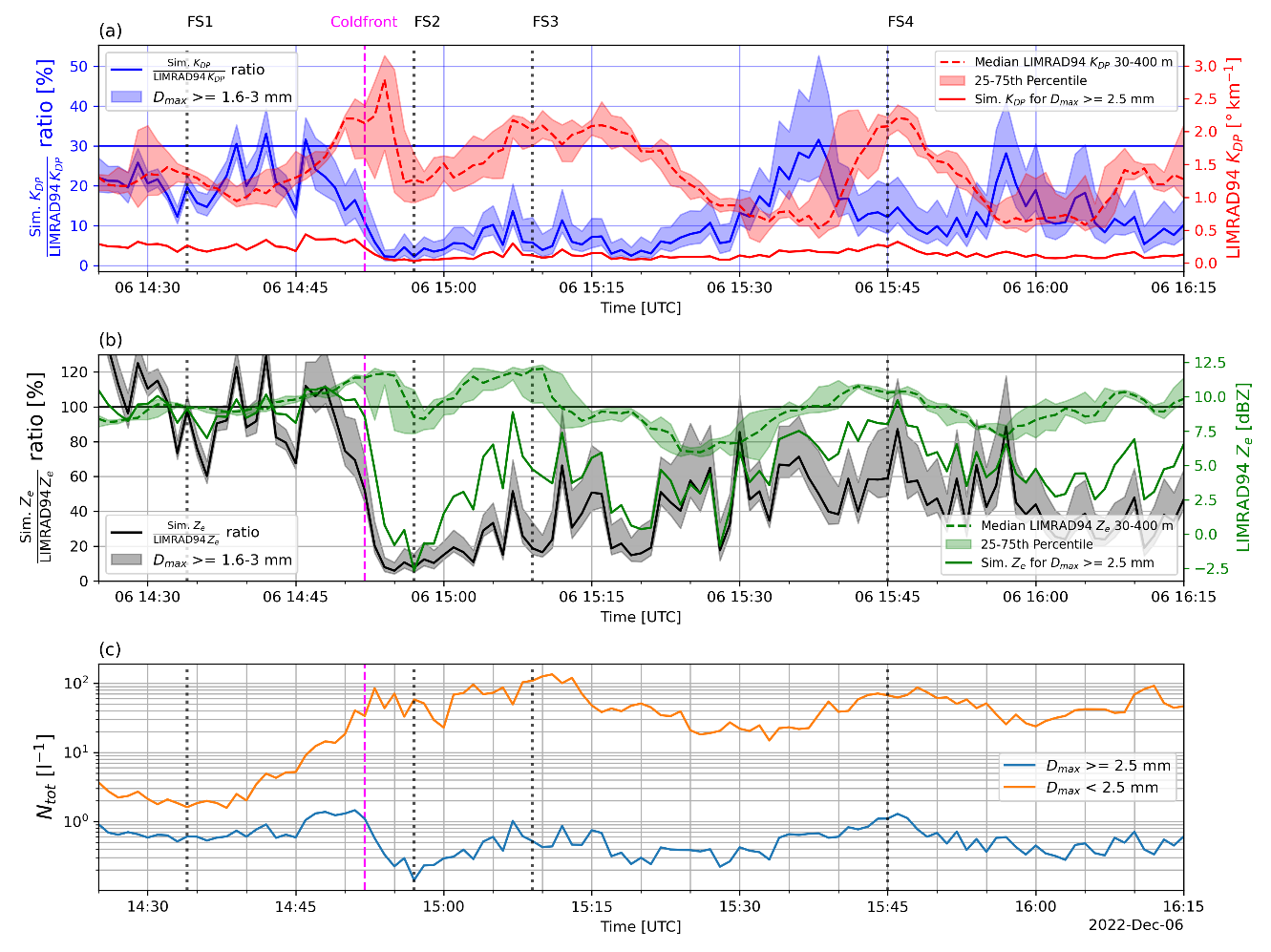 Figure 1: Panel a): Median LIMRAD94 $K_{DP}$ between $30$ and $400\,\mathrm{m}$ AGL (red dashed line) with the 25–75th percentile (red shading) and ratio of DDA-based forward simulated $K_{DP}$ ($\mathrm{Sim.}\, K_{DP}$) to observed LIMRAD94 $K_{DP}$ (blue line). For the blue line, only particles with diameter $\geq 2.5\,\mathrm{mm}$ were used; the blue shading shows the range of the simulations when just particles $\geq 3\,\mathrm{mm}$ (lower edge) or $\geq 1.6\,\mathrm{mm}$ (upper edge) are included.