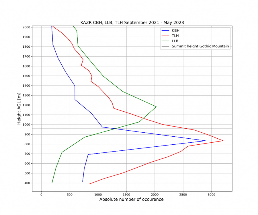 Figure 2: Statistic of turbulent layer height detected as described in Sect. 2.5 (red line), KAZR cloud base (blue line), liquid layer base height (green line) for the duration of the SAIL campaign from September 2021 to end of May 2023 when a turbulent layer was present. The black solid line marks the Gothic Mountain summit height.
