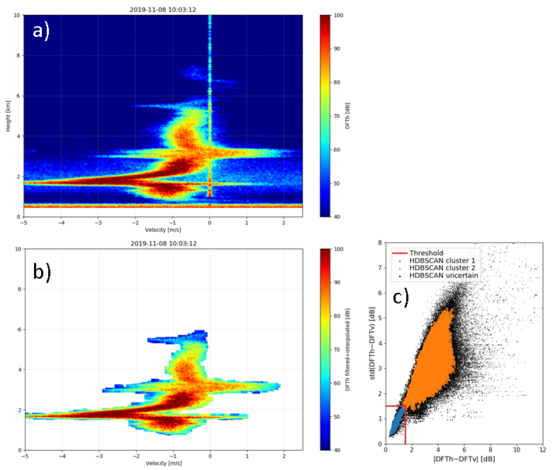 The threshold was selected based on results from a flexible, yet computation-intensive compared to simple thresholding, density-based hierarchical clustering algorithm (HDBSCAN; Campello et al. 2013) which does not require the prescription of a specific number of clusters or other characteristic features of the data clusters a priori (Figure 1c). The filter performance is not very sensitive to the exact threshold value, so the threshold value determined for one radar observation, as shown in Figure 1, can generally be applied to other radar observations during the same precipitation event and to different precipitation events. Changing the radar settings, however, can lead to a stark decrease in the performance of the threshold filter if the threshold value is not updated.