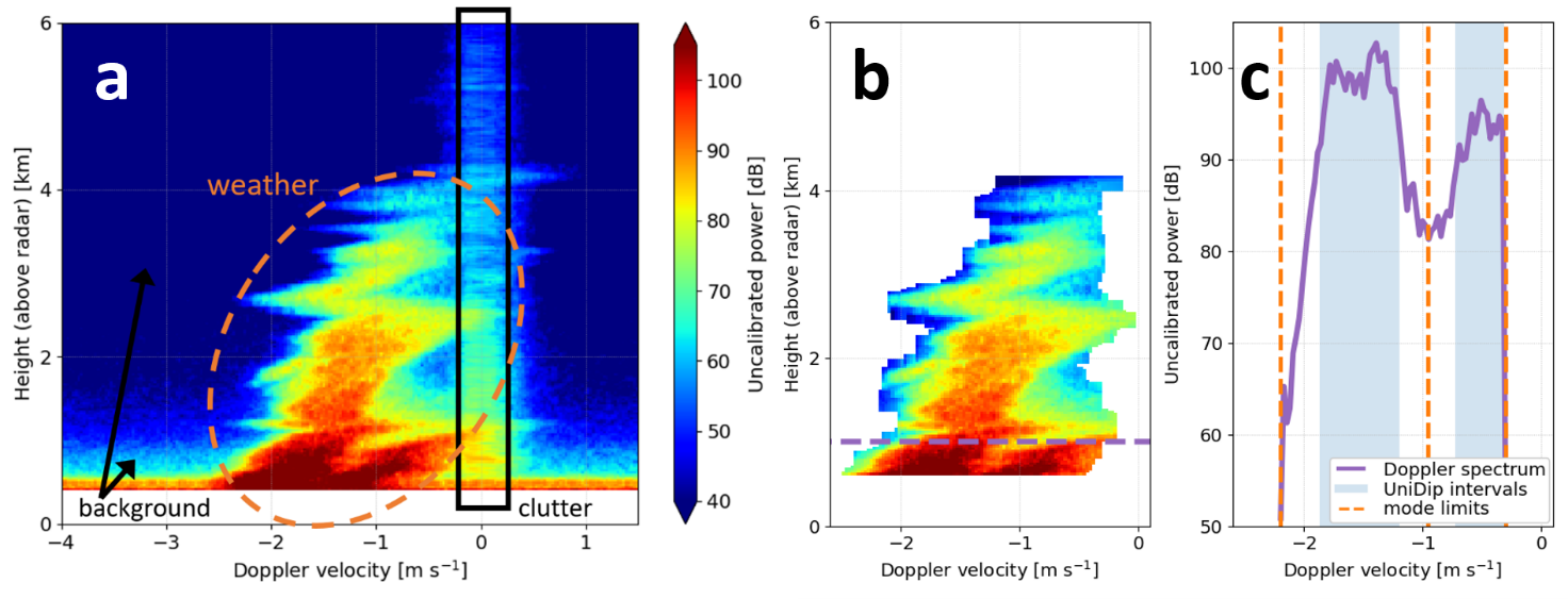 Figure 1: (a) Summary of Doppler spectra in one polarization channel from birdbath scan recorded with the MOHp C-band radar during a winter precipitation event; (b) isolated weather signal, based on polarimetric characteristics and the developed machine-learning algorithm; horizontal dashed line indicates © one example of a bimodal Doppler spectrum, with peak intervals found by UniDip clustering and with final mode limits for calculating quantitative (multi)modal properties and uncertainty estimates.