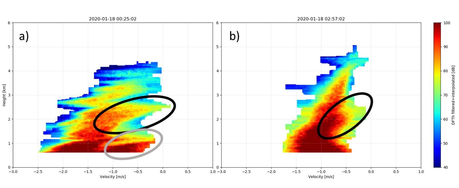 Figure 2: Doppler spectra recorded during two distinct phases of a precipitation event where the melting layer was located around 1500 m, just below the observed spectra. (a) Transition period from rain to snow, where both liquid and frozen precipitation was recorded at the ground. (b) Period of only (frozen) snowfall at the ground. Black ellipses mark potentially similar processes during the formation of precipitation; light gray ellipsis marks the fingerprint of a microphysical process only observed during the transition period, probably injecting liquid into the precipitation which persists down to the ground. Overall, Doppler spectra in (a) also show a stronger impact of wind (broadening of the Doppler spectra) compared to (b).
