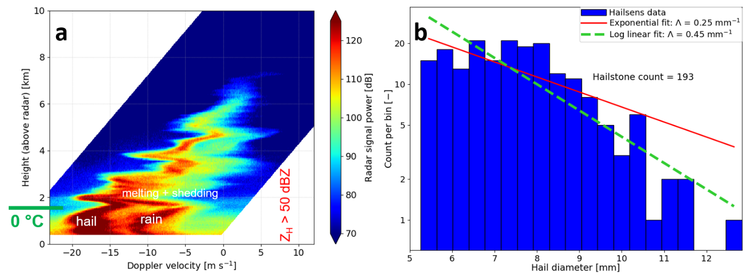 By presupposing that Doppler velocities in Figure 3a represent particle fall velocities and leveraging existing hail size-to-fallspeed relationships and hail scattering simulations, we plan to also estimate the full hail size distribution from the Doppler spectra and compare the results with the in situ data of the hail sensor. Additionally, polarimetric radar measurements and multi-Doppler analysis will contribute to disentangling the dynamics of the supercell.