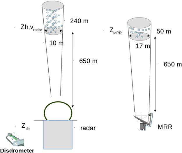 Figure 1: Schematic of measurement setup and 1st usable weather radar bin (~ 650 m above radar). Adopted from Frech et al. (2017).