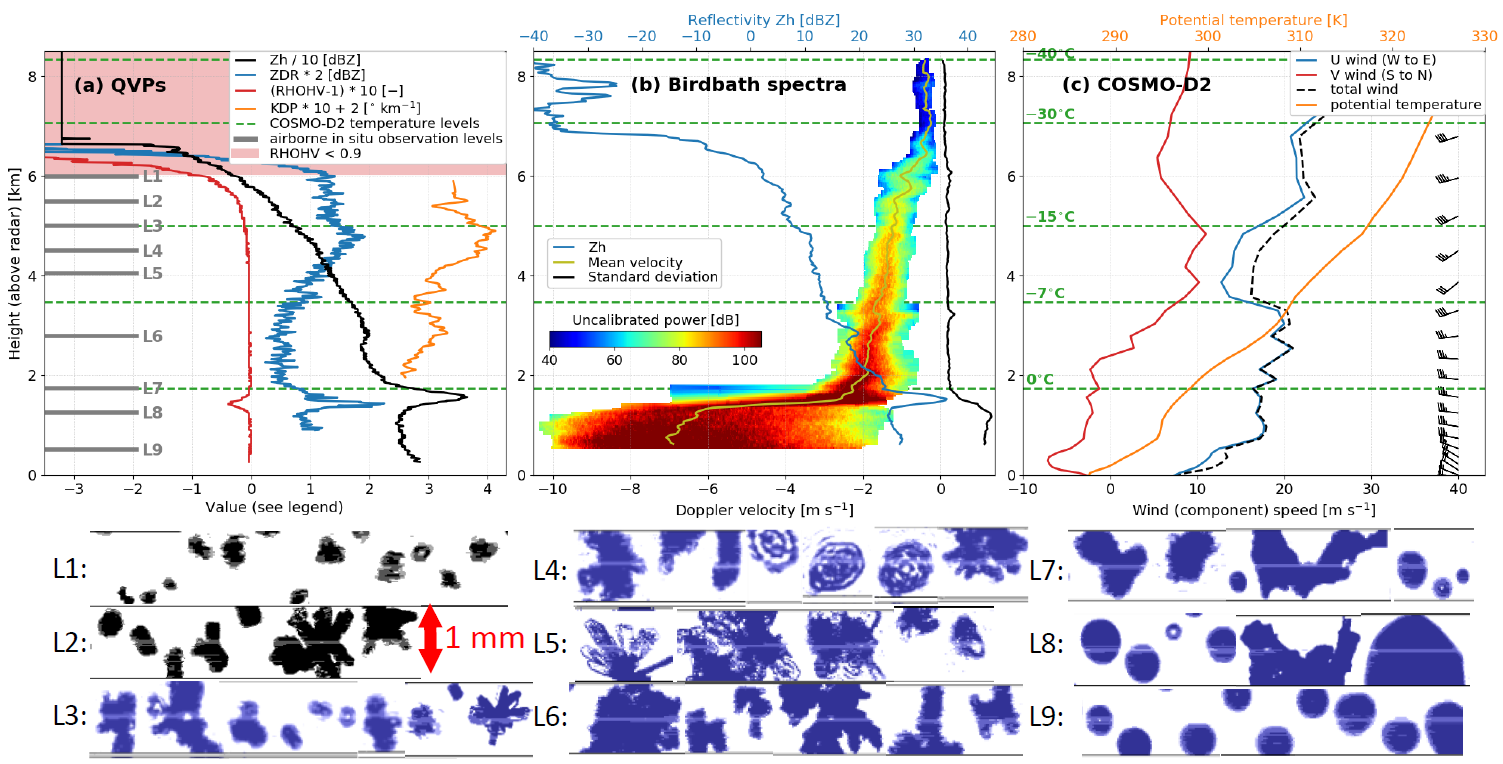 Figure 2: Summary of data collected during a spring precipitation event over MOHp C-band radar. (a) high-resolution quasi-vertical profiles (25° elevation scans) of polarimetric variables; (b) summary of birdbath scan with profiles of derived radar reflectivity (Zh), mean velocity, and standard deviation indicated by blue, yellow, and black lines, respectively; © several variables indicating the atmospheric (thermo)dynamics according to COSMO-D2 model short-term predictions; (L1-L9) particle images collected at altitudes indicated in panel a (modified from Trömel et al. 2021).