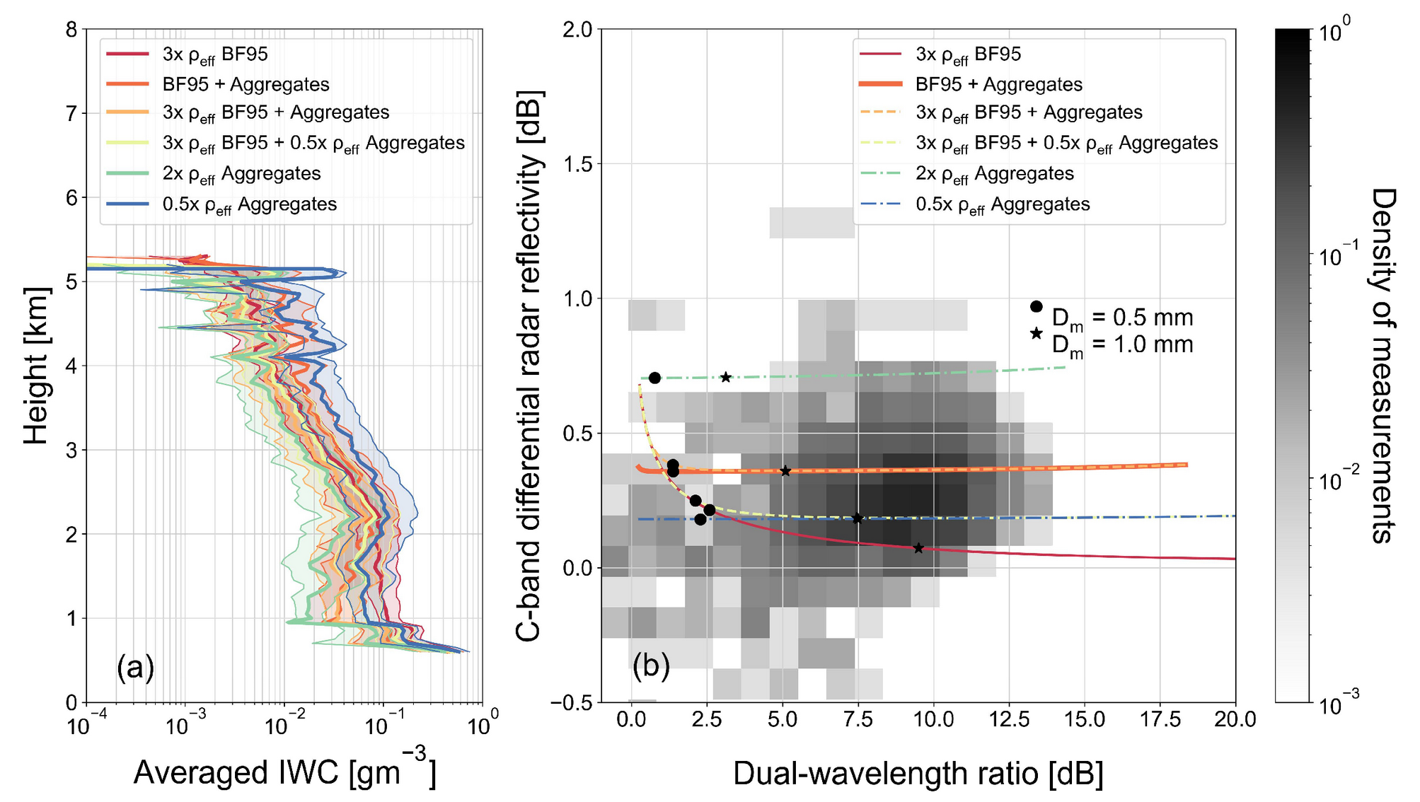 Comparing the radar measurements to T-Matrix (e.g., Waterman, 1965, Mishchenko et al., 1996, Leinonen, 2014) scattering simulations for ice particles varying their aspect ratio (AR), the median mass diameter (Dm) and the ice water content (IWC) of their particle size distribution, a simple ice microphysics retrieval resolving the shape, the size and the mass of ice hydrometeors (Fig. 2a) was developed. The detected ice particles were represented by soft spheroids (e.g., Hogan et al., 2012) following well-established mass-size relations m(Dmax) and an exponential particle size distribution (PSD). Using this approach, microphysical information of the detected ice crystal was retrieved. The retrieval results for AR, Dm, and IWC in Fig. 2b could better explain the radar measurements when the ice spheroids were considered oblates which follow the aggregates mass-size relation (Yang et al., 2000) instead of the well-known Brown and Francis (Brown and Francis, 1995). The Brown and Francis mass-size relation suggests that larger ice particles have low density and the combination with the soft spheroid model, which considers reduced-density particles to represent realistic habits of the same mass and size, could not produce simulated ZDR that matched the radar observations. Among all the assumptions used in the retrieval for the unknown ice microphysics, i.e., m(Dmax), PSD, oblate or prolate spheroid shape, horizontal flutter of the spheroids, the mass- size relation was found to be the most crucial and thus, it needs to be better constrained. Adding the slant-wise polarimetric observations along with dual-wavelength ratio by using this novel radar setup, it was found that in some regions, e.g., above the Ka-band cloud radar, ZDR not only constrains the shape of the ice hydrometeors but also reduces the uncertainty for the retrieval of the size.