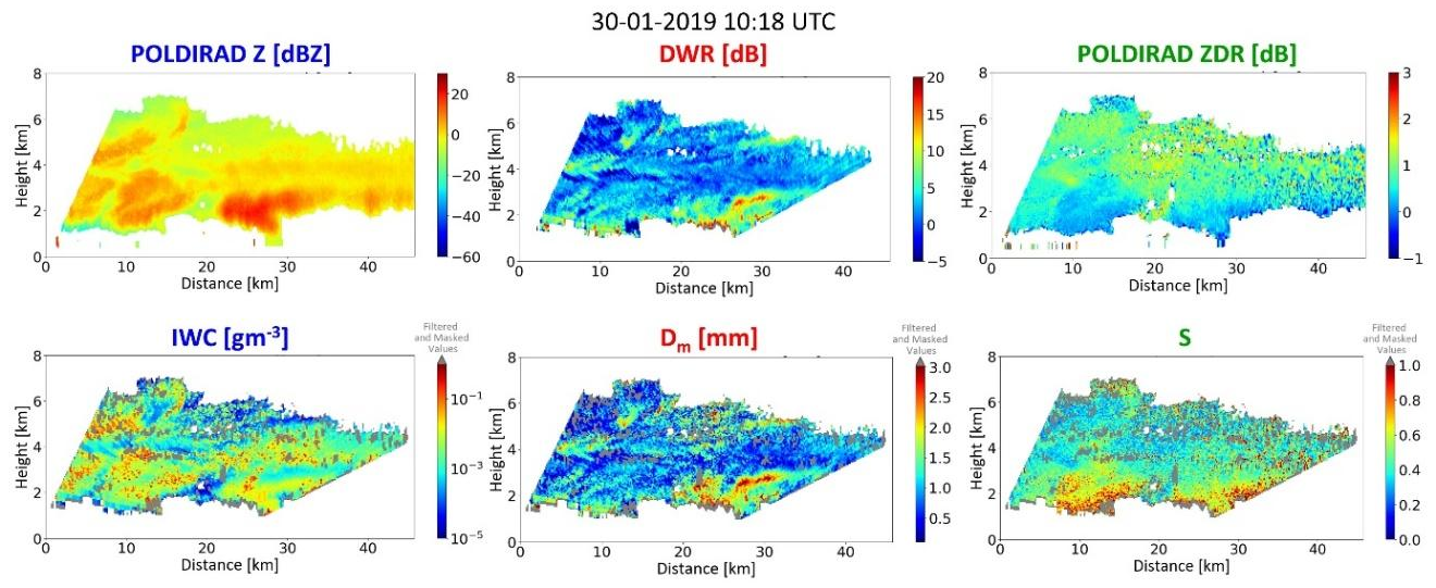 Figure 1: Radar measurements (top panels) and ice retrieval results (bottom panels) for aggregates mass-size relation (Yang et al., 2000) with respect to three degrees of freedom for 30 January 2019 at 10:18 UTC. With the labels in blue, red and green color the sensitivity to mass, size and shape is denoted, respectively.