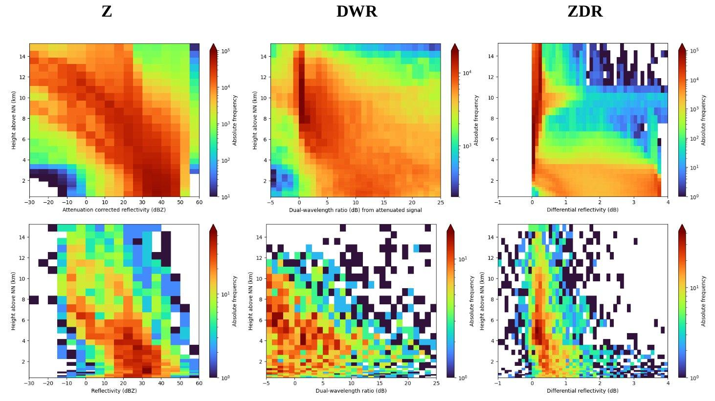 Figure 2: Contoured frequency by altitude distributions (CFAD) of simulated radar signals (Top-Panel, Thompson 2-mom scheme; Thompson et al., 2008) and measured radar signals (bottom panel) over 5 days in summer 2019. Reflectivity on the left, Dual-Wavelength Ratio DWR (radar not offset corrected) in the center, Differential Reflectivity ZDR on the right. Only convective cells according to TINT cell tracking included. Simulated reflectivity is attenuation corrected.