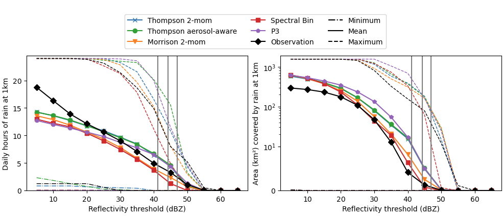 We find that the choice of microphysics schemes has a significant impact on the distribution of precipitation; the convective area fraction, i.e., the ratio of area covered by convective precipitation to the total area covered by precipitation, varies by an order of magnitude between the microphysics schemes (Fig. 1).