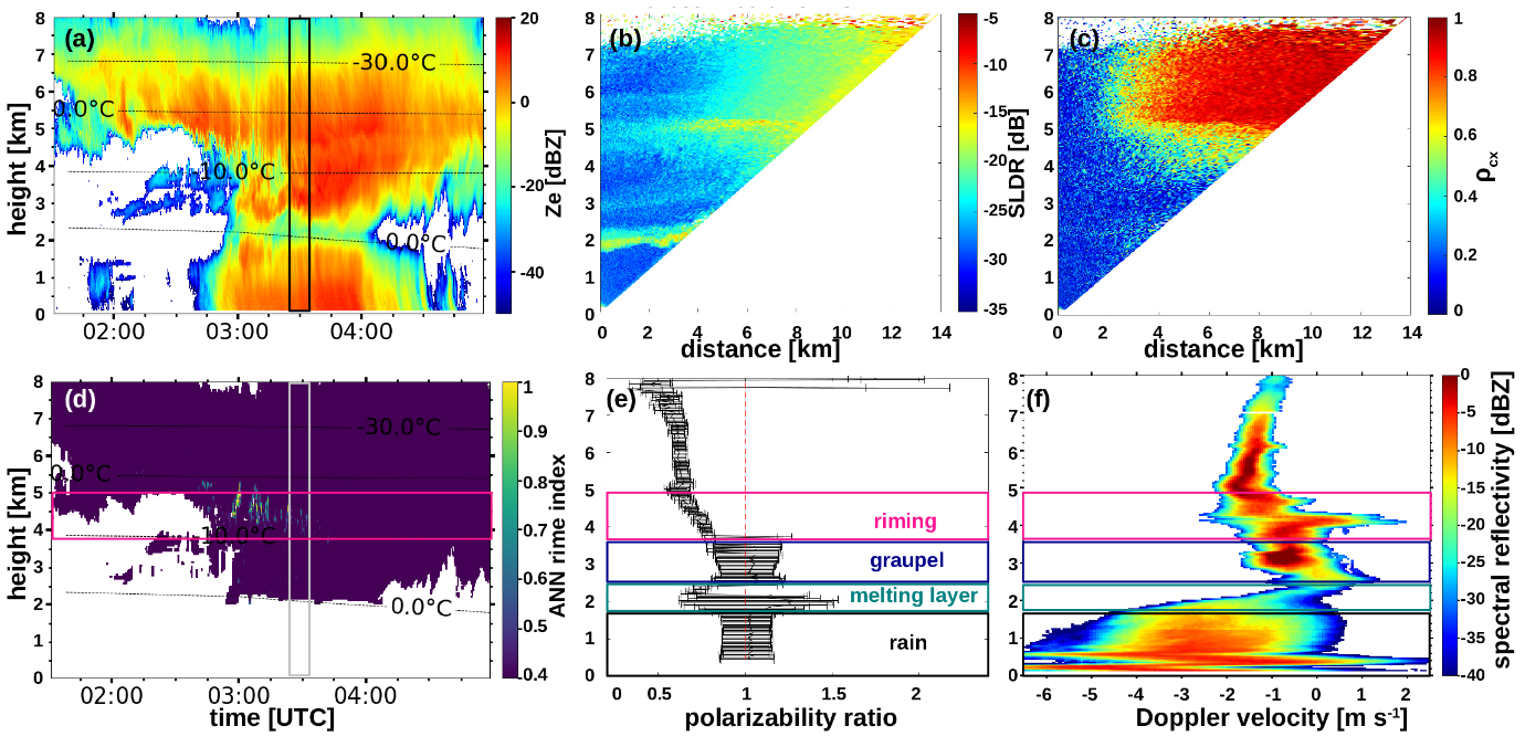 Figure 1(a) shows the time-height plot of reflectivity measured by the W-Band radar in Punta Arenas between 1 :30 and 5:00 UTC. A high ice cloud merges with mid-level layer clouds, leading to precipitation (rain) between 2:45 and 4:30 UTC. The ANN-based riming retrieval (Figure 1(d)) predicts riming for the height range between approximately 3.5 and 5 km, between 2:45 and 3:30 UTC. The height spectrogram of cloud radar Doppler spectra for 3:30 UTC (Figure 1(f)) reveals that liquid water is present up to an altitude of 5 km, corroborating the prediction of the ANN. In Figure 1(b) and 1©, RHI-scans of SLDR and ρcx are performed with a SLDR-mode scanning cloud radar used during the campaign and show a vertical stratification of the cloud where different microphysical processes can occur. The vertical distribution of the polarizability ratio (Figure 1(e)), illustrates a stable layer of oblate particles from 5 to 8km (ξ < 1), where particles precipitate into the riming layer detected by ANN between 3.8 and 5km, due to the presence of supercooled liquid droplets, and becomes more and more spherical producing graupel particles from 2.5km to 3.8km (ξ = 1). The ANN is able to detect riming while the VDPS method allows us to observe graupel particles producing by riming processes. The combination of these two methods add important information for the differentiation of riming and aggregation processes.