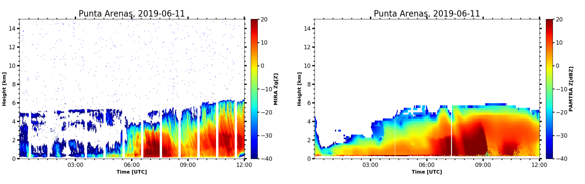 Figure 3: Left panel: Measured reflectivity (Ka-band) on June 11, 2019 in Punta Arenas. Right panel: Forward-simulated reflectivity at Ka-band using the PAMTRA forward model. The ICON model was run at 10 km horizontal grid resolution for this case.