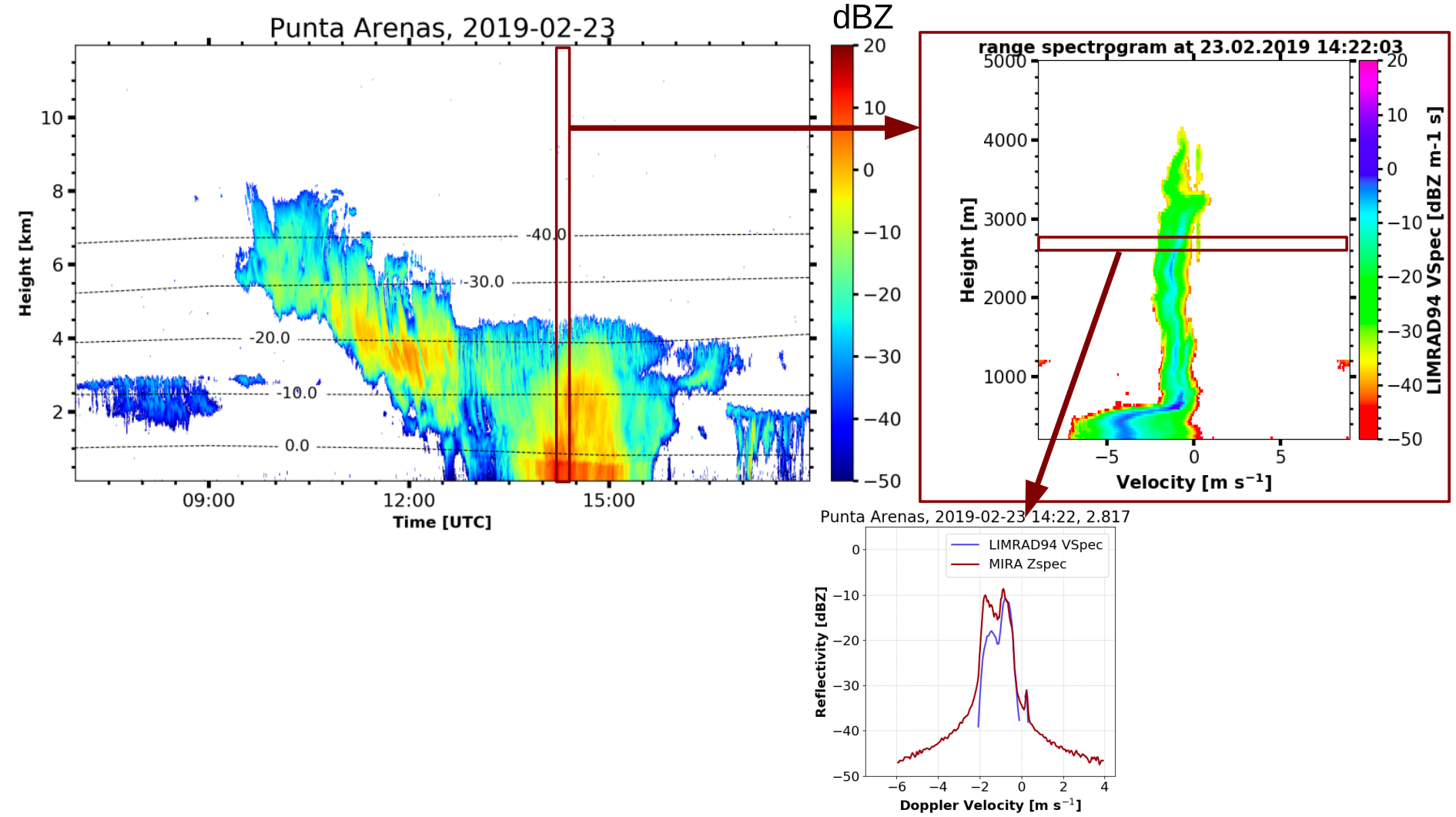 Figure 2: Example for riming signature evident in cloud radar Doppler spectra. The top left panel shows the radar reflectivity measured by the W-band radar on February 23, 2019 in Punta Arenas. In the top right panel, a range spectrogram at 14:22 UTC is plotted. The bottom panel shows Doppler spectra measured by the W-band (blue) and the Ka-band (red) at approximately the same time and range. Both spectra exhibit a narrow liquid water peak at around 0 m/s Doppler velocity.