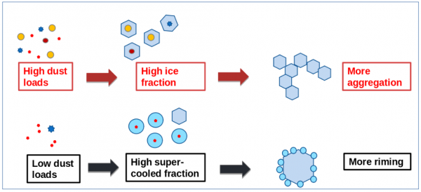 Figure 1: Schematic of the PICNICC hypothesis: Large concentrations in INP (mainly dust) lead to a higher ice fraction in clouds, thus promoting growth by aggregation. When INP concentrations are low, more supercooled liquid water will be present in the clouds, and riming will occur more frequently.