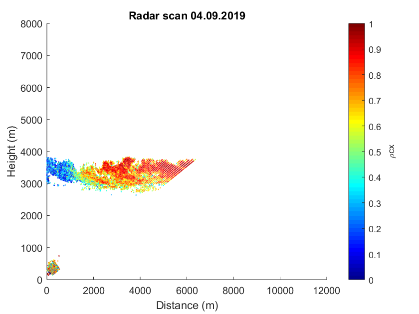 From the hourly SLDR-mode RHI scans of MIRA-35, profiles of the shape and orientation of particles can be derived for detected cloud layers. Figure 5 represents a specific case of mixed-phase cloud observed in Punta Arenas on 4th September 2019. For example, for the given positive gradient in both SLDR and cross correlation coefficient with decreasing elevation (increasing distance) informs us about the presence of dendritic hydrometeors.