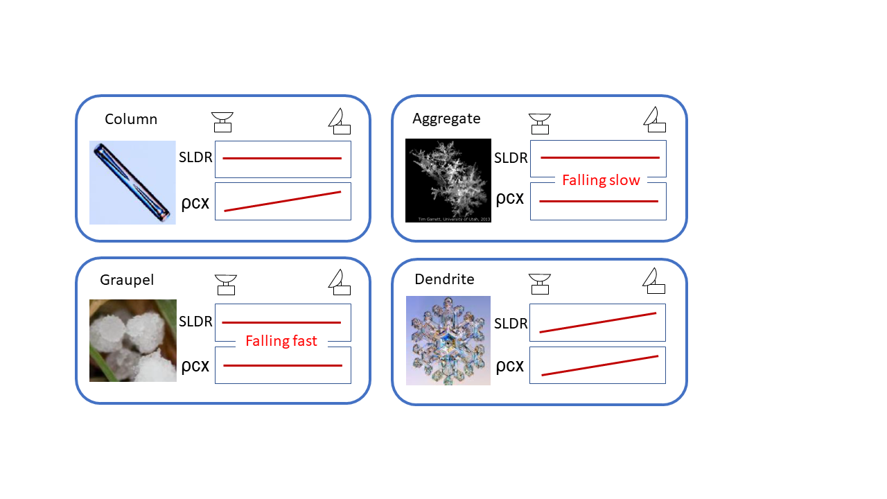 The combination of the gradient of both SLDR and cross correlation coefficient for elevations from 30° to 90° permits us to differentiate the main ice particle shapes, as is illustrated in Figure 4 below. Considering in addition the fall velocity of the particles yields to a refinement in the differentiation between spherically shaped aggregates and graupel.