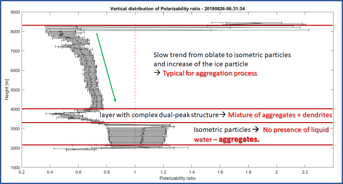 Figure 1: Vertical distribution of the polarizability ratio on 26 August 2019 at 6:31 UTC, measured during the DACAPO-PESO campaign in Punta Arenas, Chile. This case study represents an example of aggregation processes.