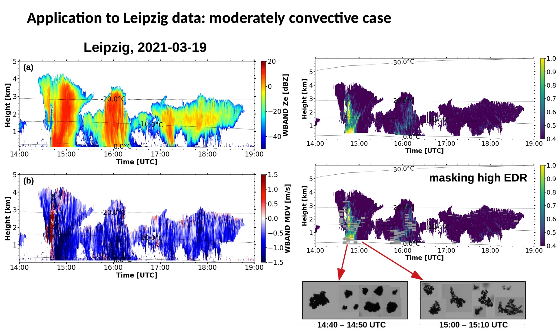 Figure 2: Left-hand panels: Radar moments measured during the case on 19 March 2021. (a) Radar reflectivity in dBZ (b) Mean Doppler Velocity. Right-hand panels: Riming during the case on 19 March 2021 as predicted by the ANN (top: unmasked, bottom: pixels with EDR above the threshold of 10−3 m2 s−3 are masked in gray). Bottom panels: images taken by the VISSS during the period from 14:40 to 14:50 UTC, and the period from 15:00 to 15:10 UTC.