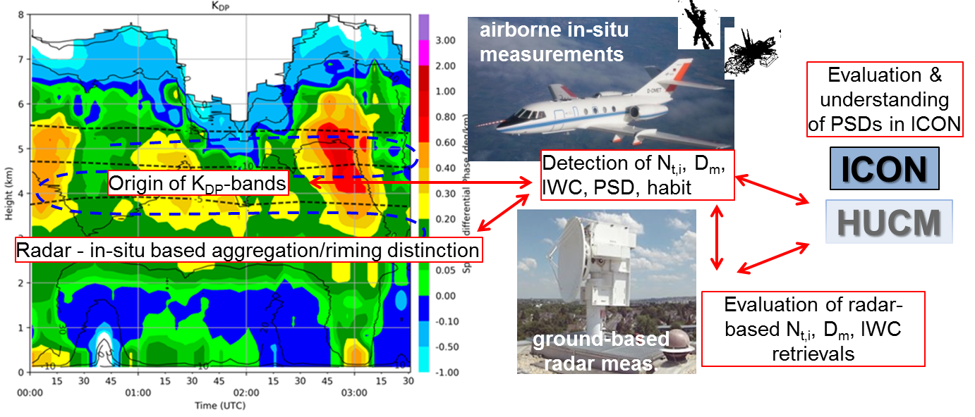 POLICE will exploit radar polarimetry for quantitative process studies in mixed phase clouds and for model evaluation. In-situ measurements of microphysical cloud parameters will be performed with the research aircraft HALO and the Falcon in the dendritic ice growth layer (DGL) and the melting layer below to evaluate targeted hypotheses on the origin of enhanced specific differential phase KDP in the DGL and quantify different indicators for the discrimination between aggregation and riming processes in the clouds. This will enable the set-up of a discrimination algorithm based on polarimetric weather radar measurements. Both the explanation of KDP-bands and the ability to distinguish between aggregation and riming is crucial for data assimilation and model microphysics above the melting layer. The in-situ measurements are used to evaluate the state-of the art retrievals of particle number concentration Nt, mean particle diameter Dm and ice water content IWC from the polarimetric radar signals and to evaluate the representation of particle type and size in the ICON-LAM model. The use of advanced spectral bin microphysical schemes in the Hebrew University Cloud Model (HUCM) in combination with measured cloud profiles will