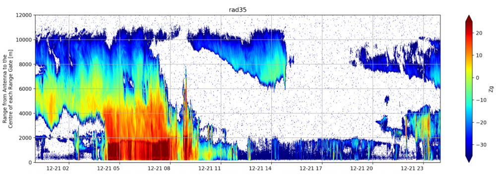 Because only scattering data for realistically shaped cloud ice, but not for snow, was applied so far, little change is observed in the simulations’ “polarimetric void” layer between 3 – 6 km, where snow dominates. This issue will be tackled in the next step when DDA scattering data for aggregate particles becomes available.