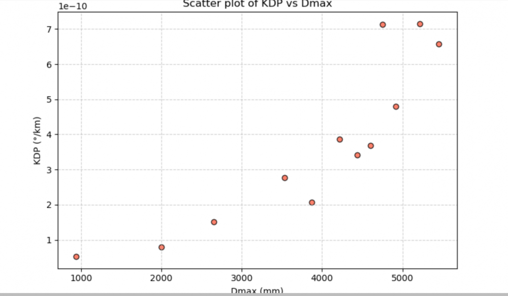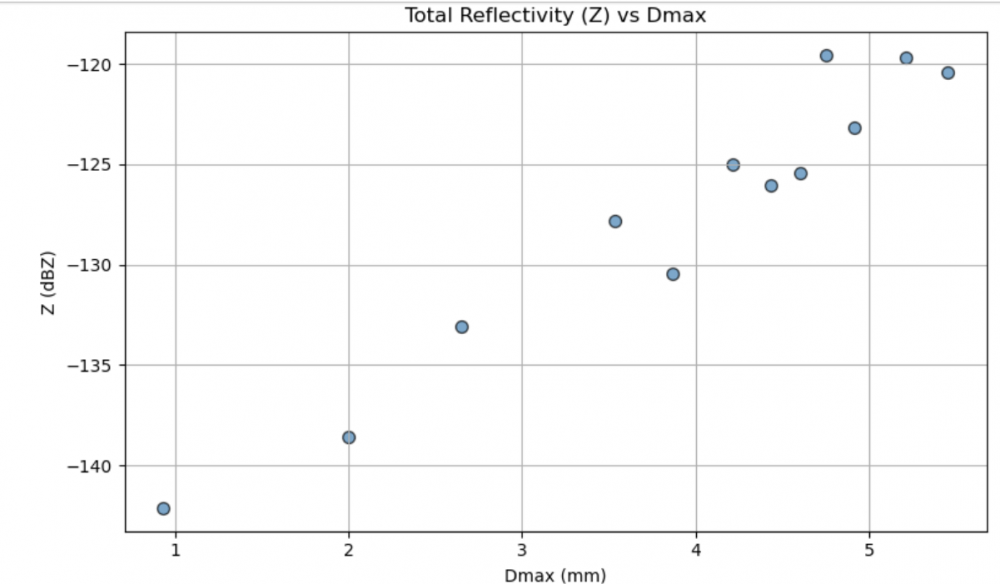 Figure 2b shows that $K_{\text{DP}}$ (specific differential phase) increases slightly with $D_{\text{max}}$, though overall values are very small (on the order of $10^{-10}$ $^\circ/\,\text{km}$). Figure 2c shows the increasing of reflectivity as the size increases, which is expected. We are processing the simulations for thousands of particles present in the clouds and a robust statistics to be formed out of those simulations.