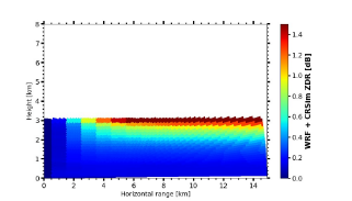 Figure. 3: CR-SIM tests: 1. A range-height indicator (RHI) plot of differential reflectivity (ZDR) simulated from an Arctic case (WRF model 2013-05-02, Barrow). Radar frequency is 35 GHz, and range resolution is 100m.